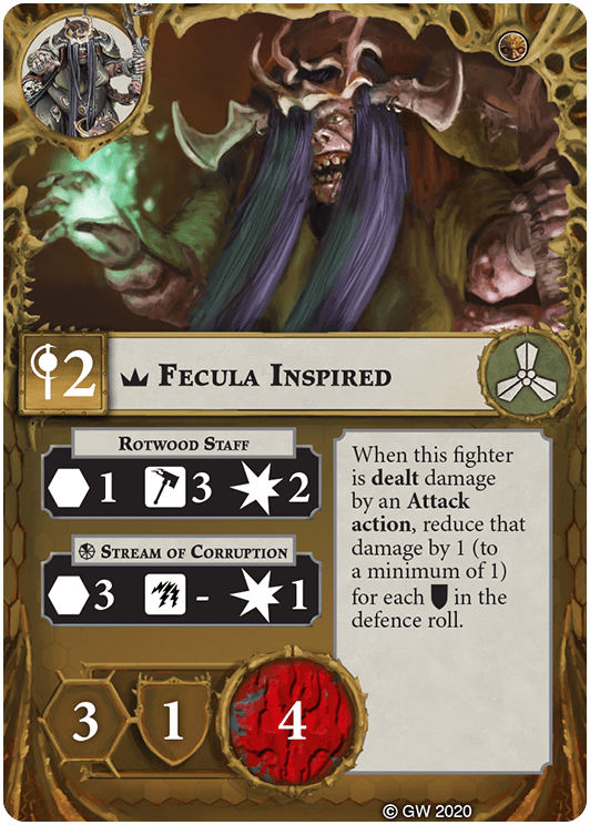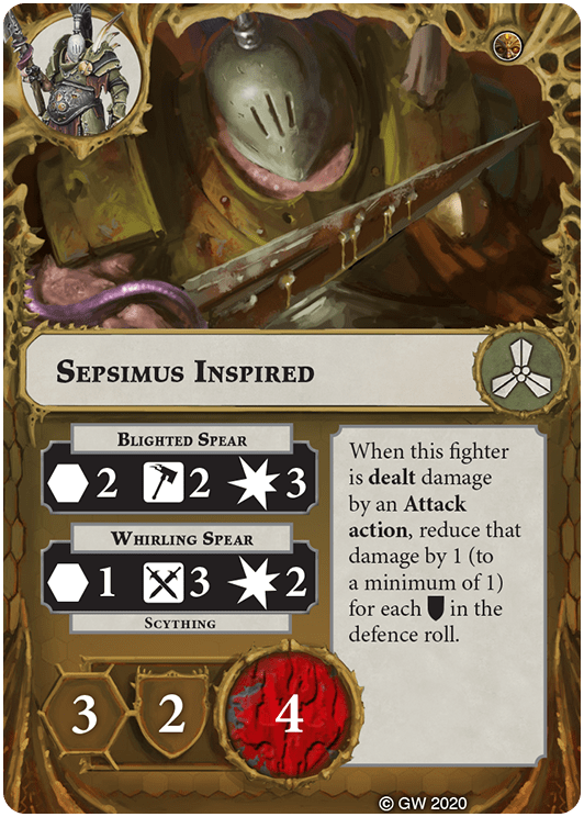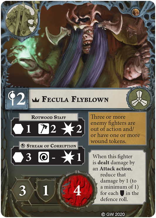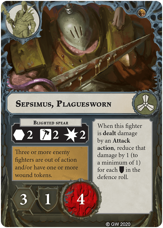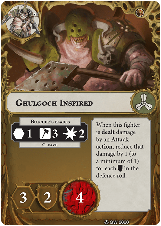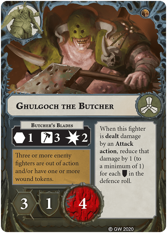 You can re-roll one attack dice in this fighter's attack rolls for Range 1 and Range 2 Attack actions. | - | Ghulgoch the Butcher, Sepsimus Plaguesworn |