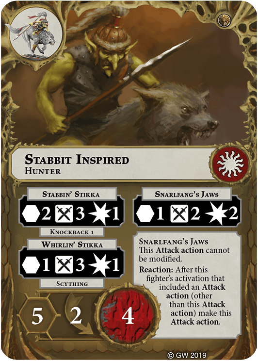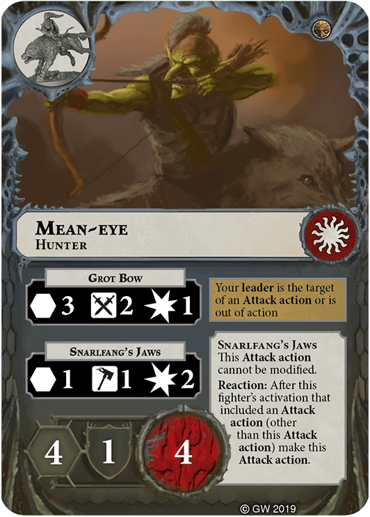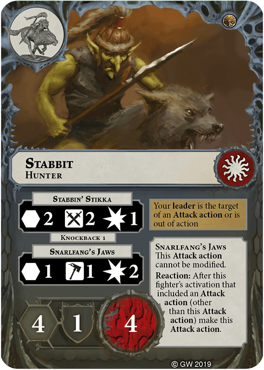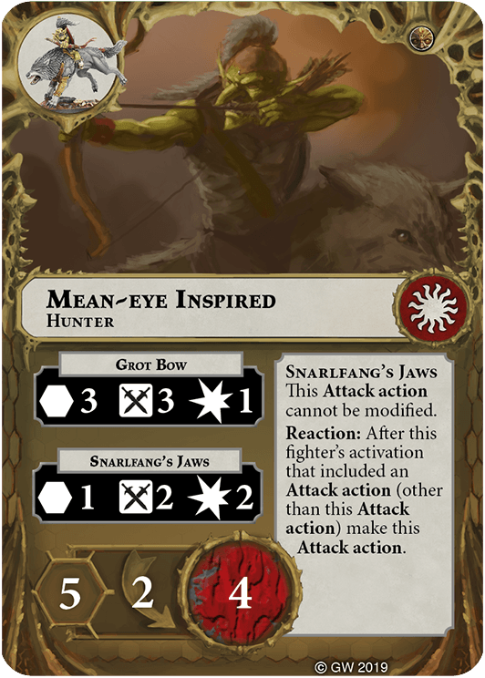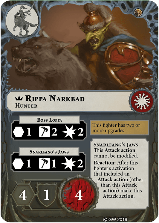 You can re-roll any number of dice in this fighter's attack rolls for the Snarlfang's Jaws Attack action. | - | Rippa Narkbad |