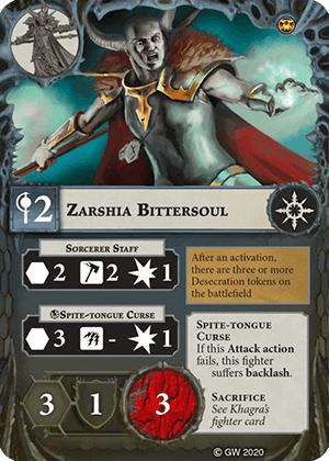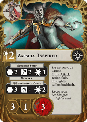 Play this if your leader is out of action. The friendly Zarshia is a leader, has +1 Wounds and +1 wizard level. This effect persists until that fighter is taken out of action. | - | Zarshia Bittersoul |