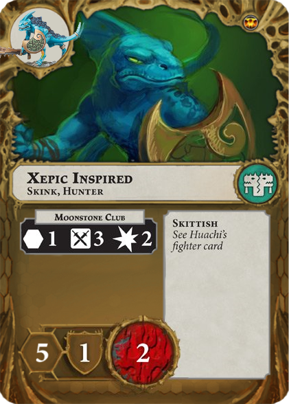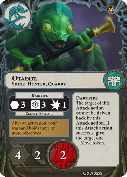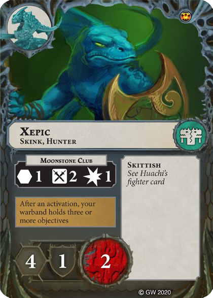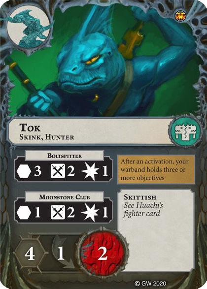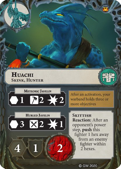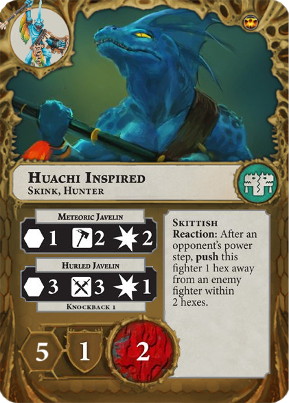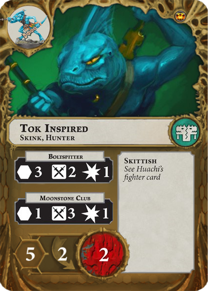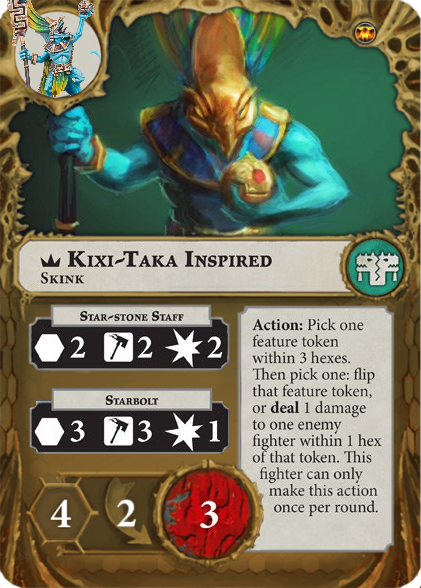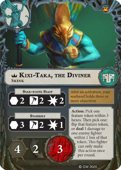 If this fighter is within 3 hexes of a friendly Skink that is the target of an Attack action, you can re-roll one defence dice in that Skink's defence roll. | - | Kixi-Taka, The Diviner |