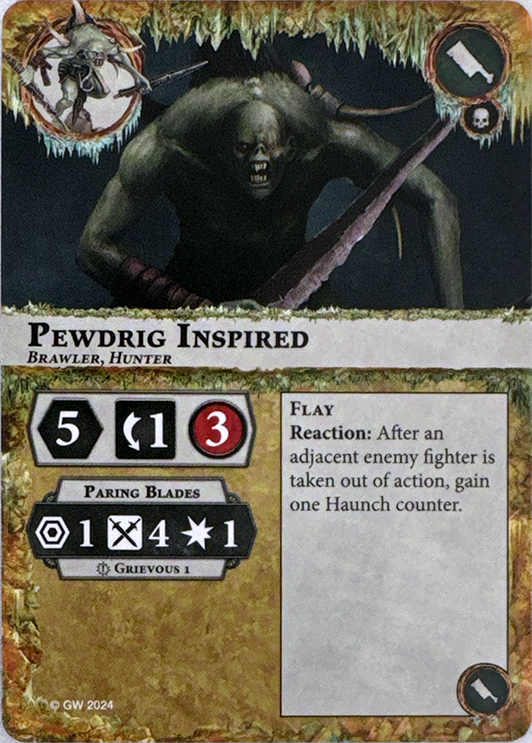 Choose a friendly fighter. If you have no Haunch counters, you can re-roll each dice in the attack roll of the first Attack action made by the chosen fighter in the next activation. If you have one or more Haunch counters, you can re-roll one dice in the attack roll of the first Attack action made by the chosen fighter in the next activation. | - | - |