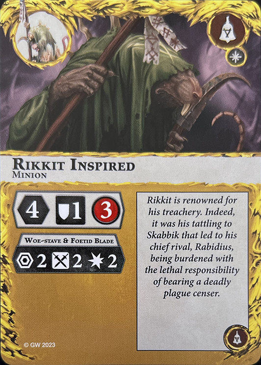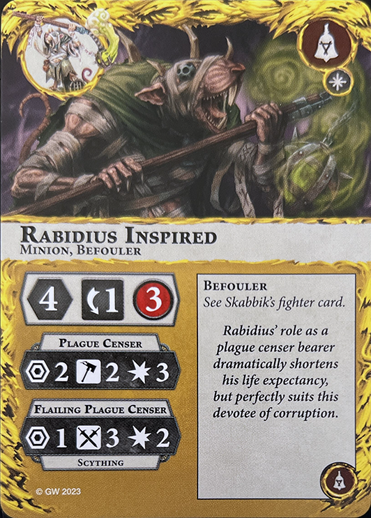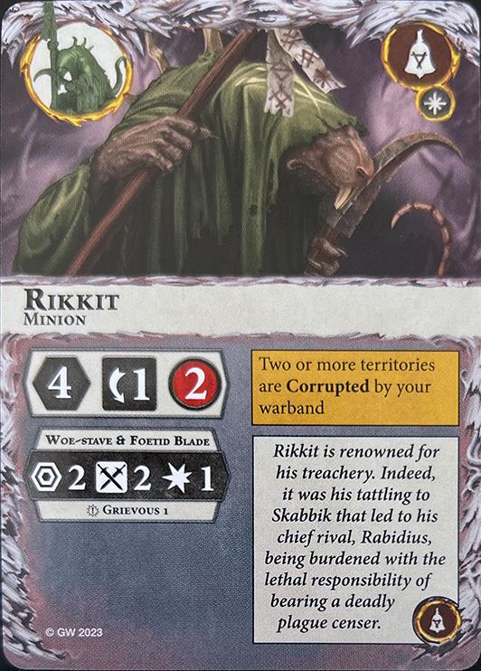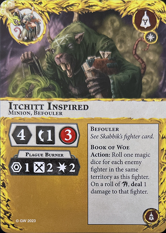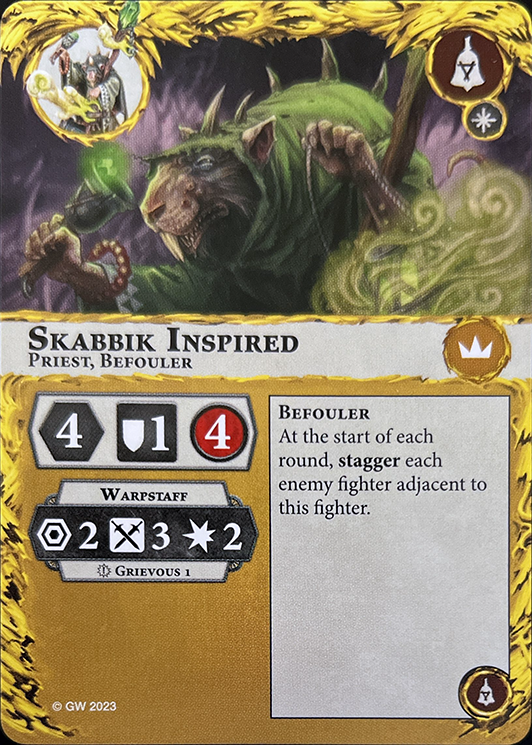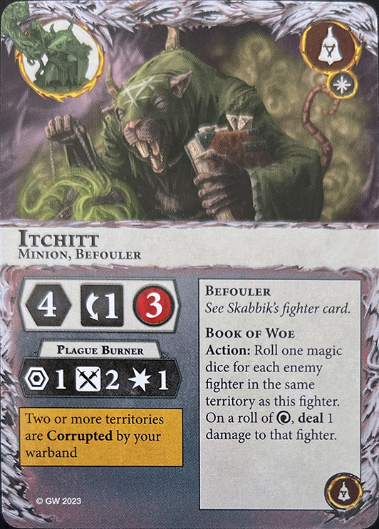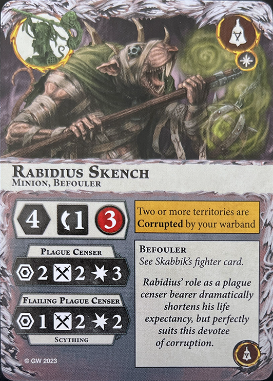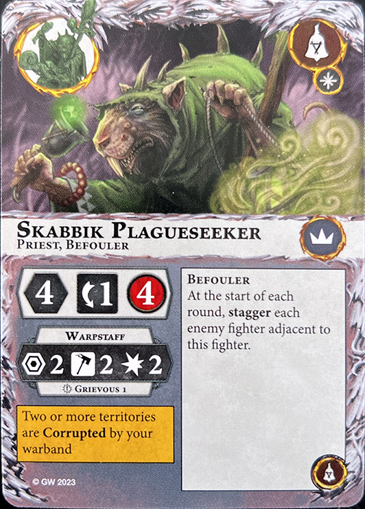This fighter is a Priest. If one or more friendly leaders are out of action, this fighter is a leader. Action: The territory this fighter is in is Corrupted by your warband. |