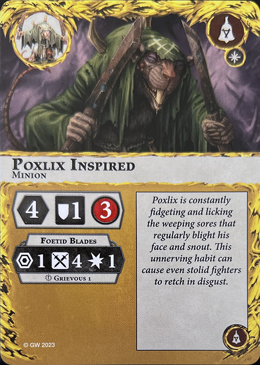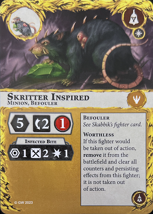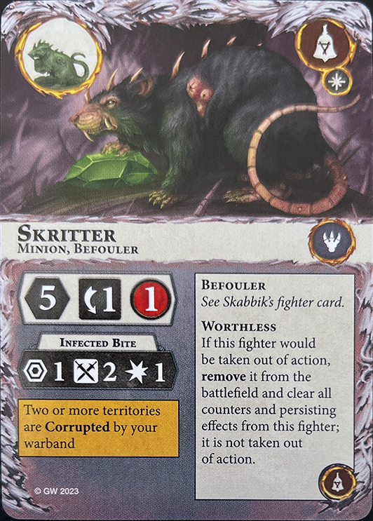 When this fighter is taken out of action, if the territory they are in is not Corrupted by your warband, that territory is Corrupted by your warband. Otherwise, gain 1 glory point, then break this card. | - | - |