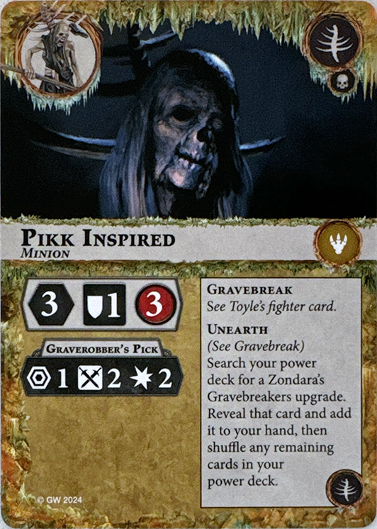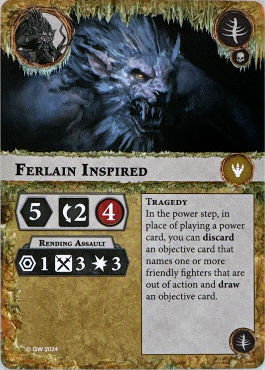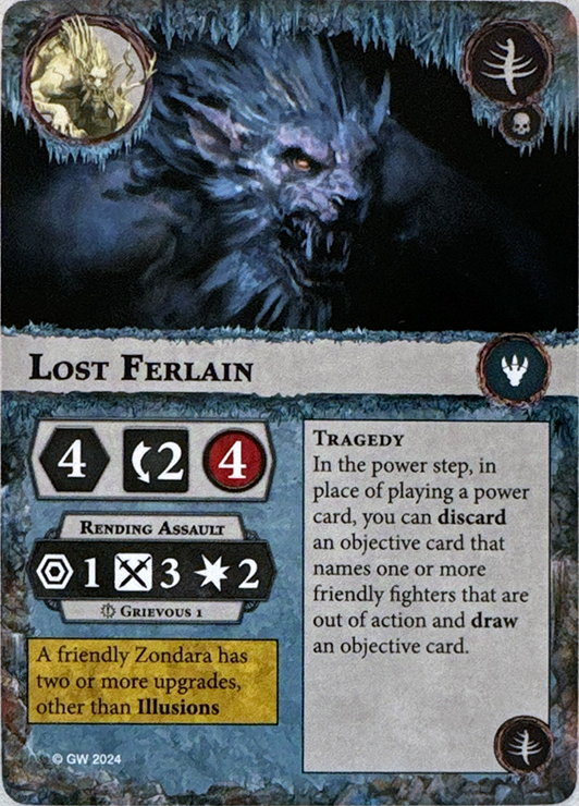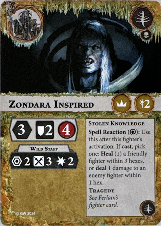 While a friendly Zondara or a friendly Ferlain is out of action, +1 Dice to this fighter's Attack actions and this fighter is Inspired. Reaction: When a friendly Zondara or a friendly Ferlain is taken out of action, give this to a friendly fighter. Do not spend any glory points when you do so. |