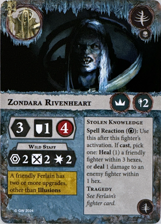 Reaction: Play this after an enemy fighter's Move action that ends within 2 hexes of a friendly Zondara. Push another friendly fighter up to 2 hexes, or up to 4 hexes if that fighter is Ferlain, so they are adjacent to that enemy fighter. | - | Zondara Rivenheart |
