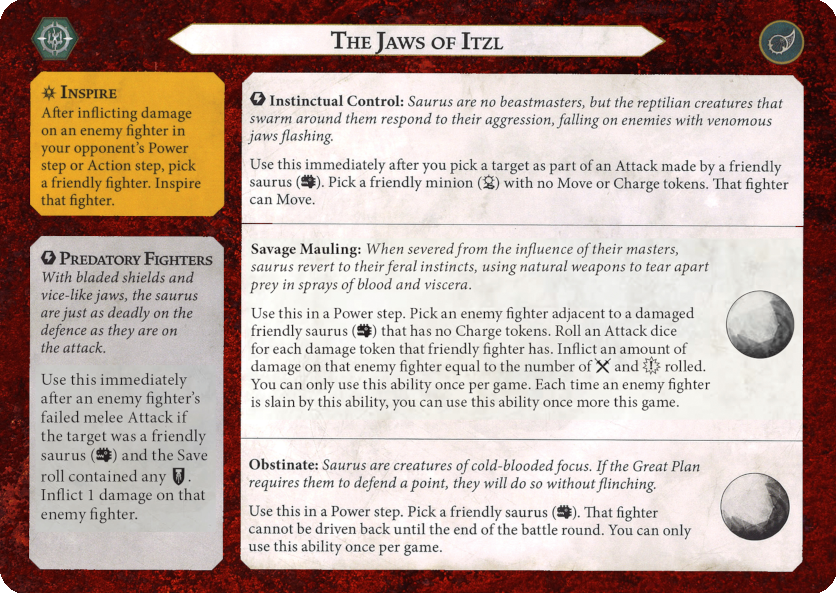 Stomp: Immediately after your last Action step in a battle round, pick an adjacent enemy fighter that is not vulnerable. Inflict 1 damage on that fighter. Then, roll an Attack dice. On an Smash, discard this card. |